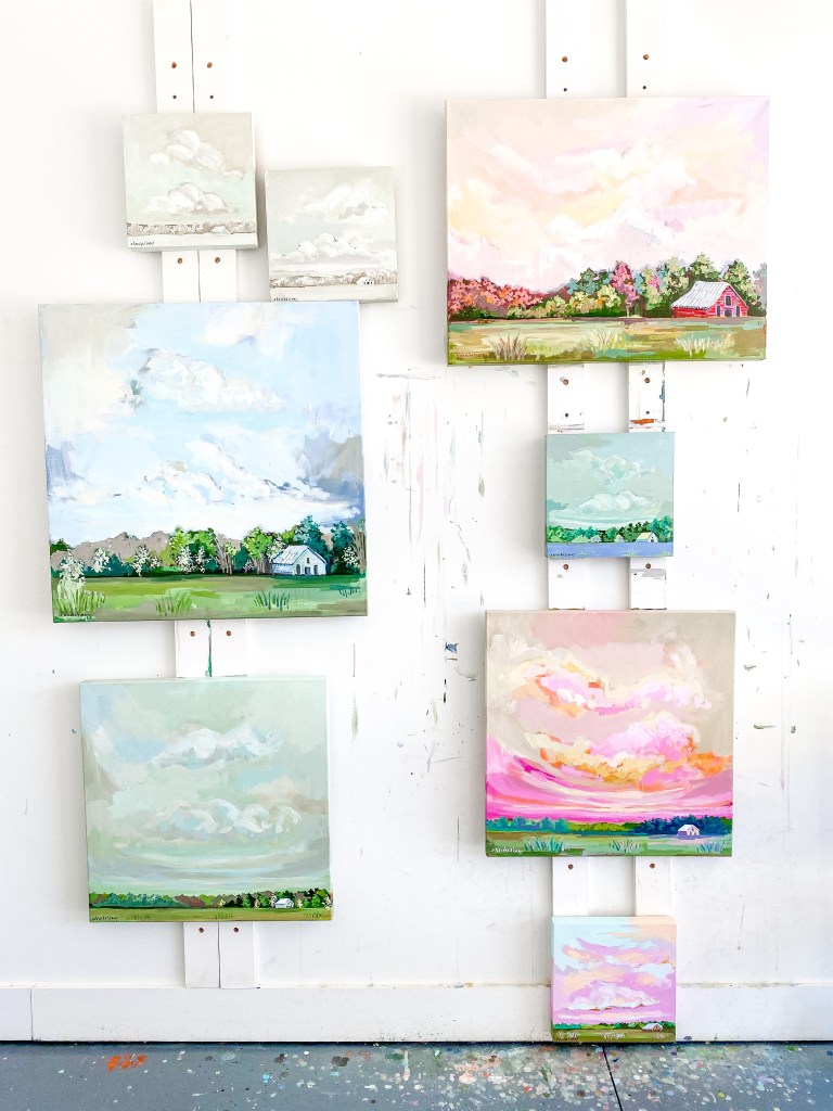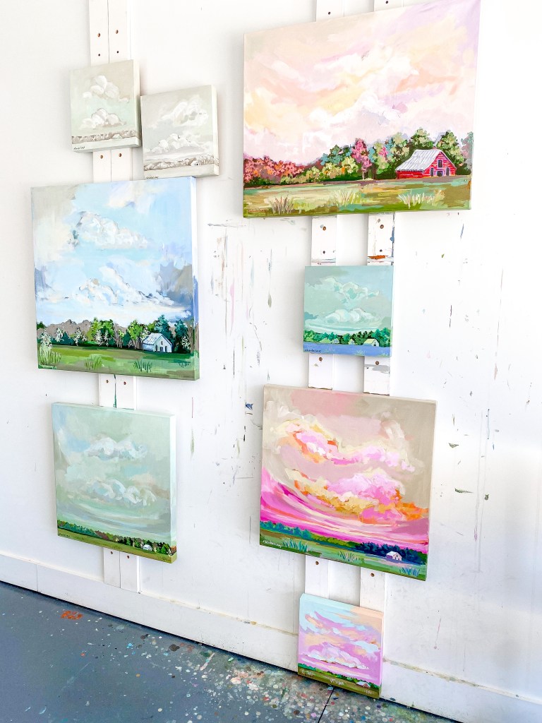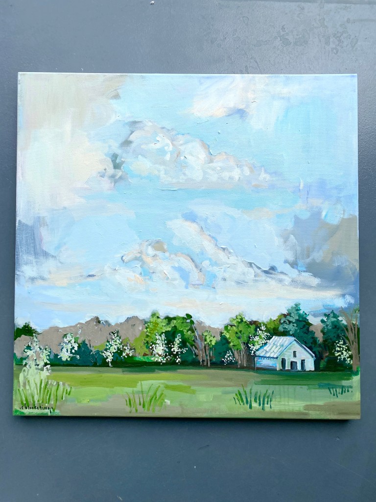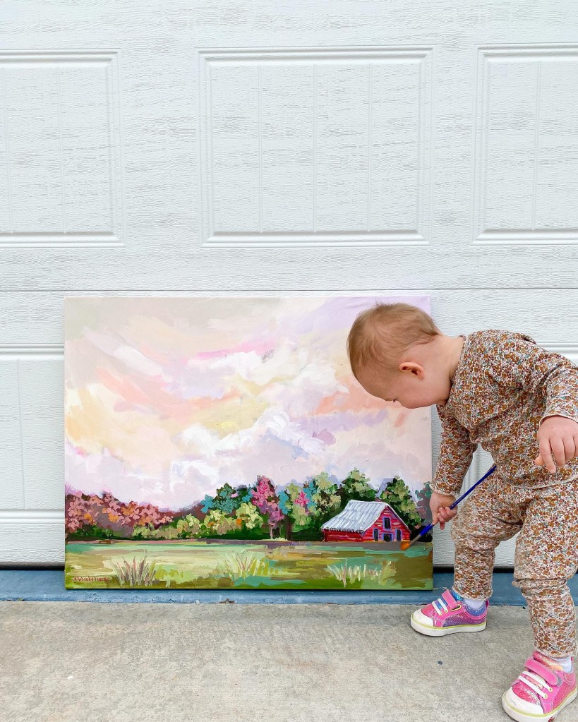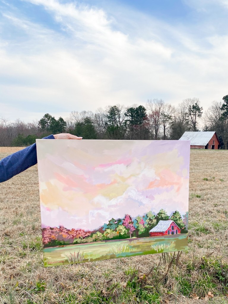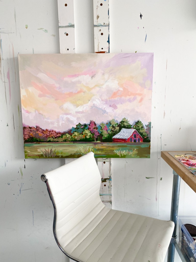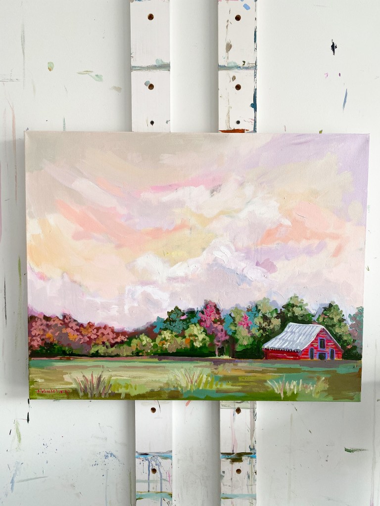 I’ve stared at the barn across the street from our house for the past year. Every season, the view seems to surpass the last. The sun rises off to the left, just over the hill and spills its’ warm golden light across the field every morning. I’ve dreamt of capturing it ever since we moved in to this house – painting it in my head – blocking in the spectacular colors and dancing my brush across the canvas in attempt to recreate the same warmth and energy the sun gives off so effortlessly. I finally put my ideas to canvas and decided that I need to paint a few barn paintings.